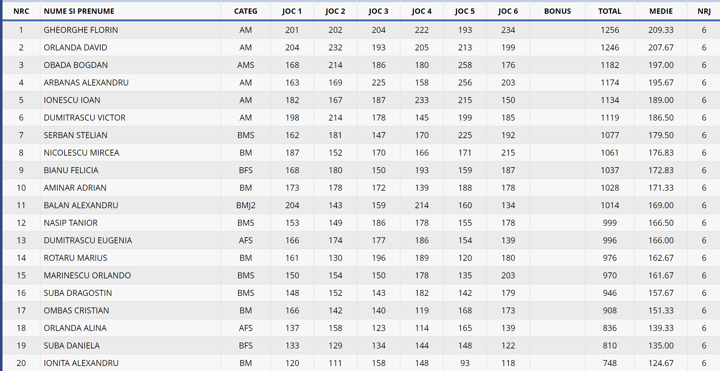 Tavi Craciun 233 medie, Balan 215,67, Romeo 215.