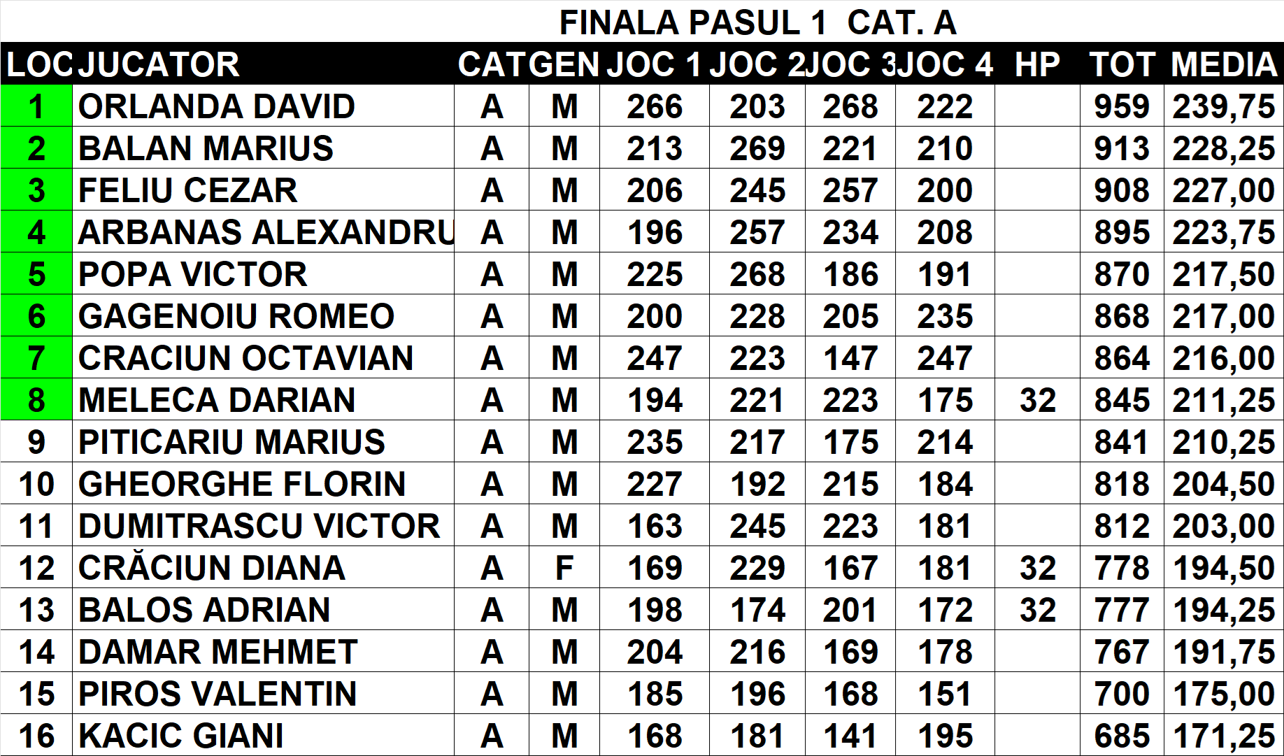 La B, Alex Balan da 201 media si urca pe 2, iar Feliu Lucian da 197 si urca pe 4.